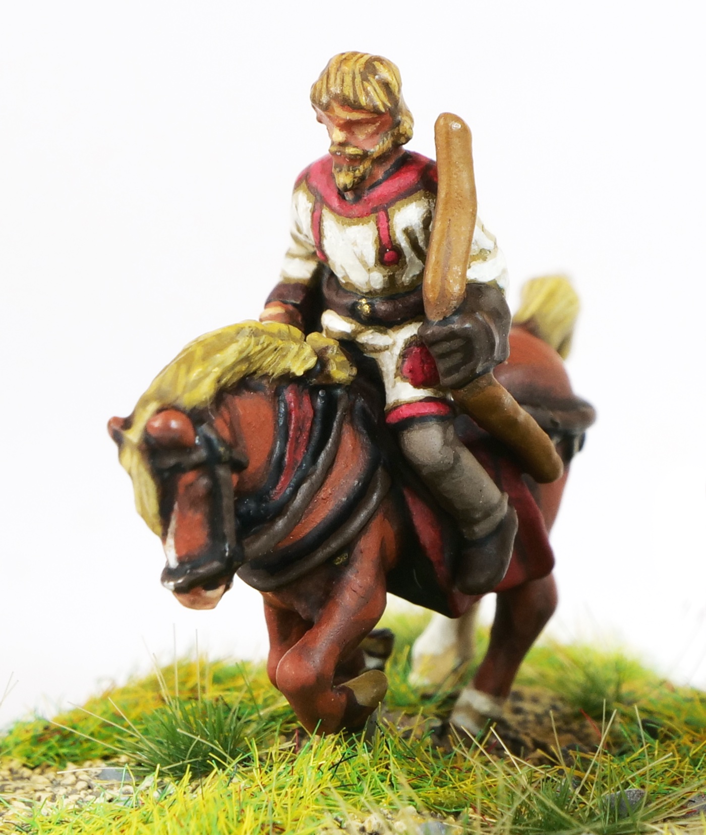 The basic figure for the riders is an Asgard (later Table Top Games and now Alternative Armies' Isarus range) LRC1 Late Roman Horse Archer. As usual with figures of that vintage, there was only one variant so, to get more variety, I did a couple of head swaps from spare helmeted figures and made typical late Roman round hats for three more from Milliput. I'm not sure why they are all holding their bows in their right hands - unless they really are all left handed it seems an awkward way of doing things.